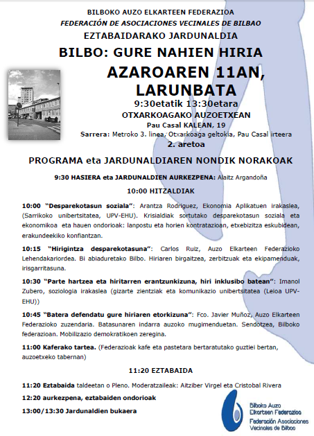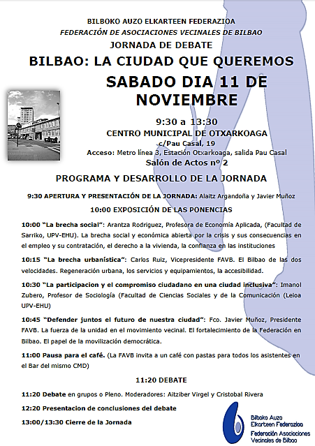 10:45h PONENCIA "Defender juntos el futuro de nuestra ciudad" (Javier Muñoz, Presidente FAAVV Bilbao)