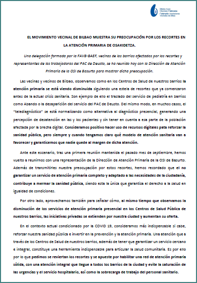 El grupo de Salud de la Federación está manteniendo reuniones con representantes vecinales y de las trabajadoras de Osakidetza, así como con Osalde y otras organizaciones para estudiar esta situación. A la reunión con la OSI de Basurto del 14 de diciembre, que queda informada aquí, se añade la presentación de una moción en el Pleno del Ayuntamiento, así como el apoyo a las movilizaciones convocadas en Deusto. |