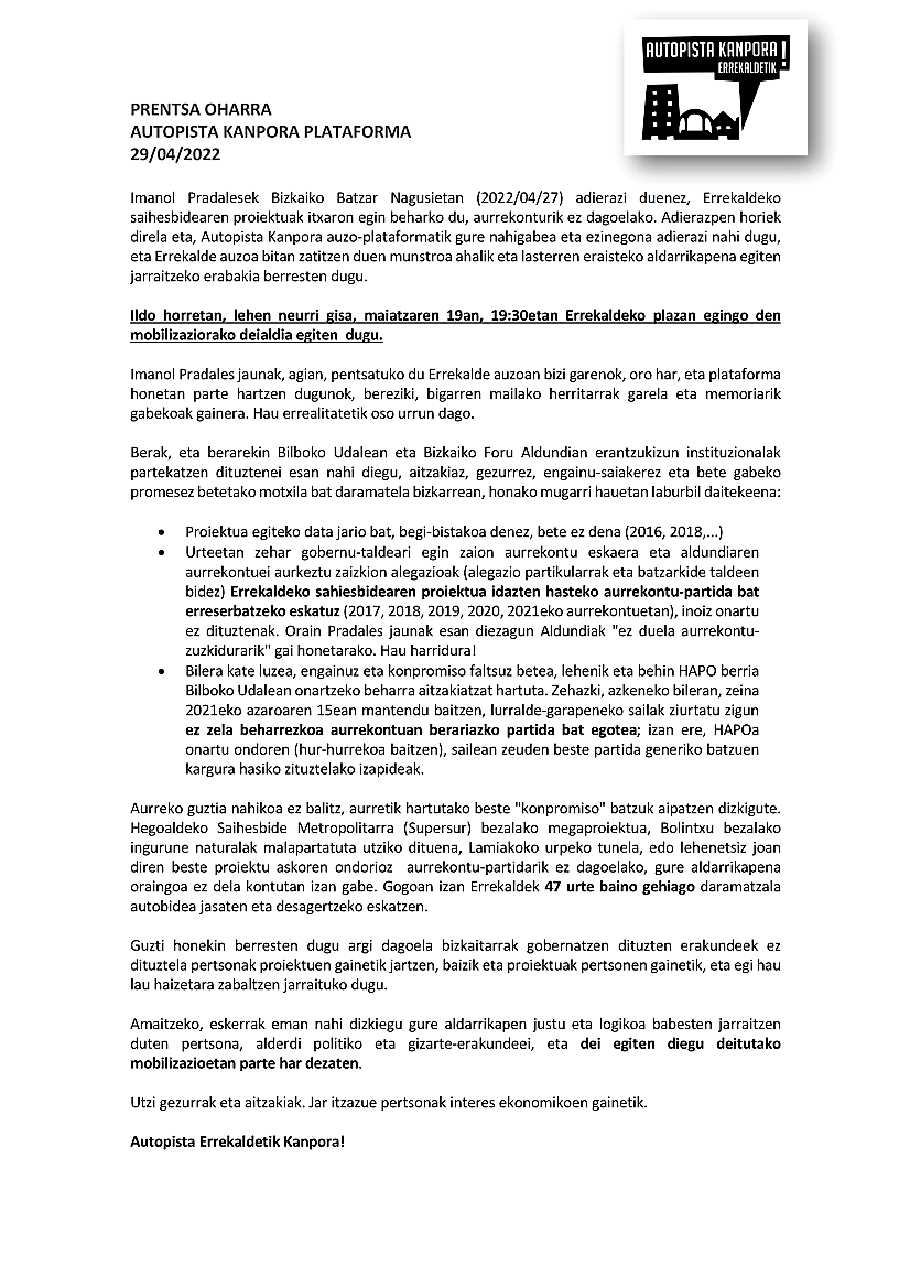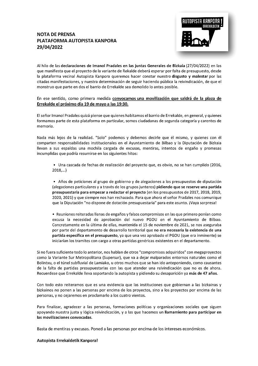 MALESTAR EN EL COLECTIVO AUTOPISTA KANPORA POR LAS ÚLTIMAS NOTICIAS DE LA DIPUTACIÓN
