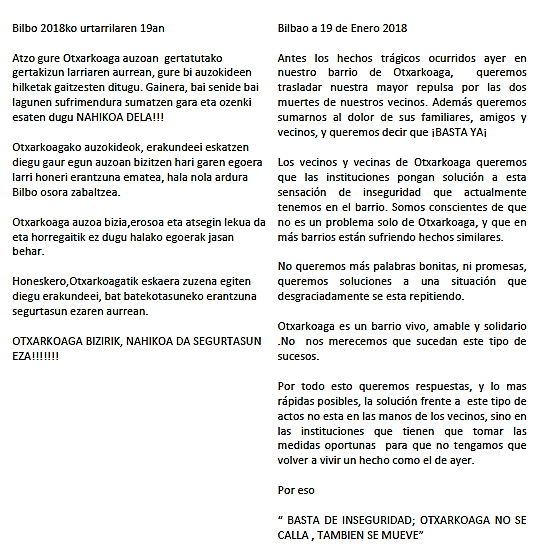 Los hechos acaecidos el 18 de Enero en Otxarkoaga, en la que fué brutalmente asesinada una pareja de personas mayores, han causado una honda conmoción en Bilbao y, especialmente, en el barrio.