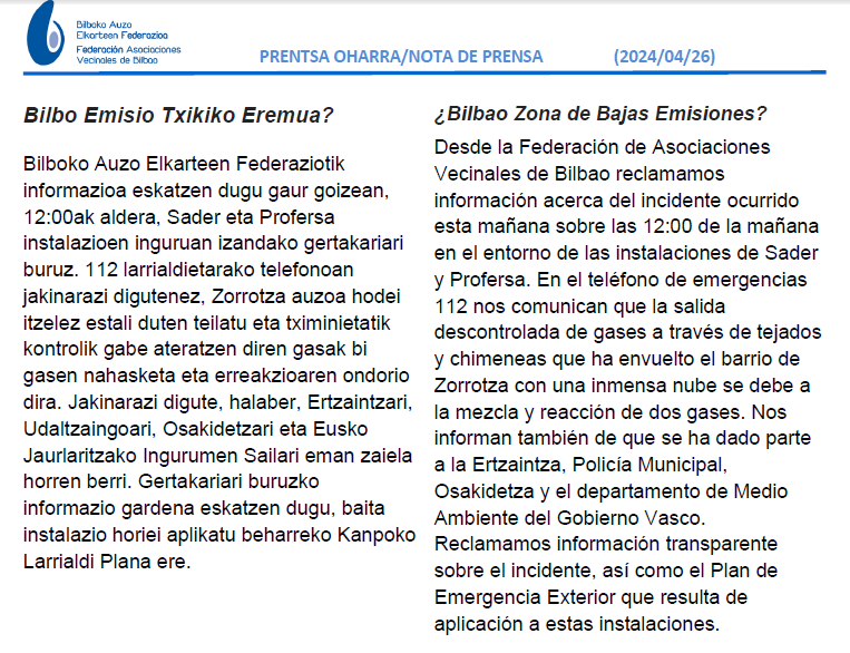 Desde la Asociación Vecinal de Basurto reclamamos el traslado a un emplazamiento seguro tanto para Profersa (dedicada a la producción de fertilizantes químicos) como de Sader (dedicada a la gestión de residuos peligrosos) cuyas labores entendemos que son necesarias. Sin embargo, la salida de estas mercantiles se sigue retrasando a la espera de la aprobación del Plan Especial de Punta Zorrotza. Mientras tanto, seguimos tan siquiera sin medidores de calidad de aire en la zona que evidencien, si es así, el cumplimiento de la ley.